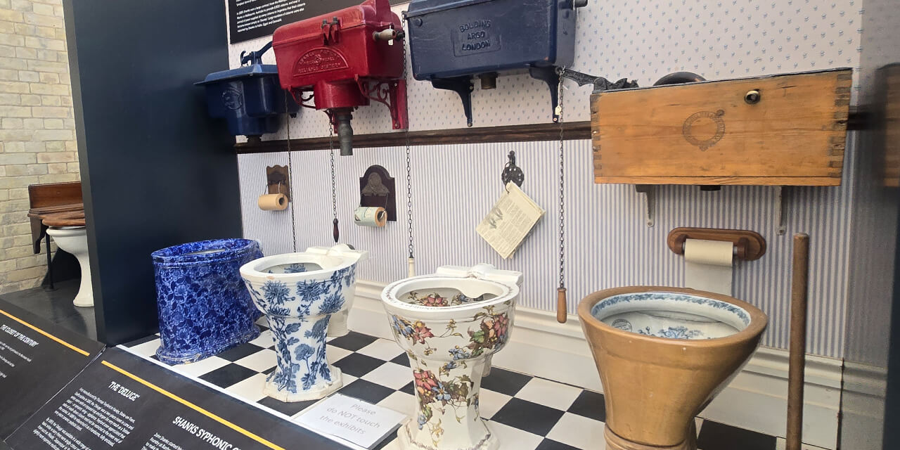建物の内部は小さな博物館になっていて、排水設備の資料や道具や機械、昔のトイレなどが展示されています。